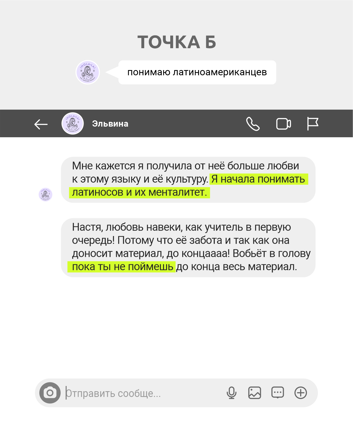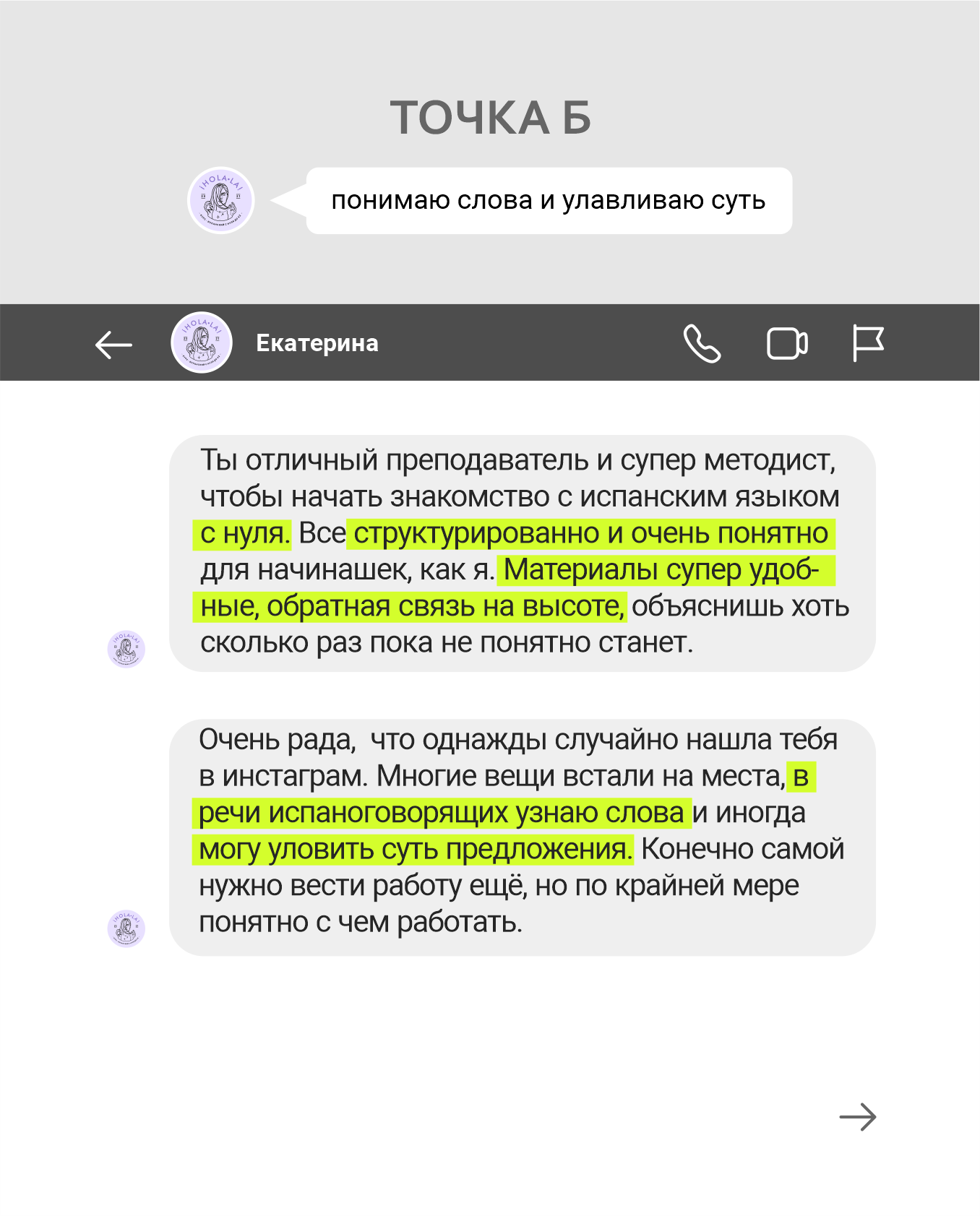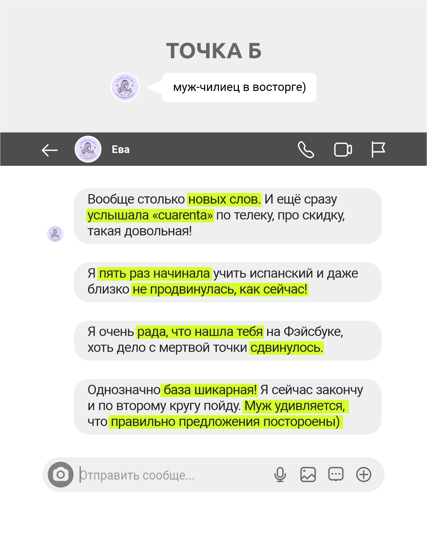 Точка А: нужен был язык, т.к. на начало курса Ева уже 2 месяца как переехала в Чили с мужем (чилийцем) + 5 раз начинала учить язык, но безуспешно.