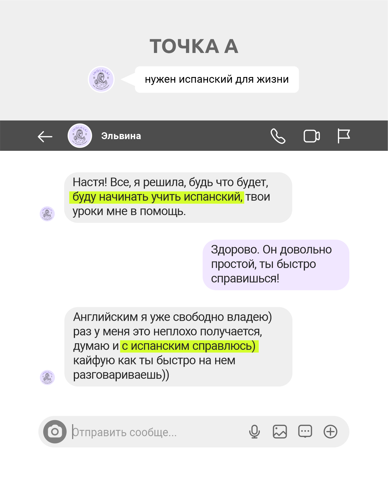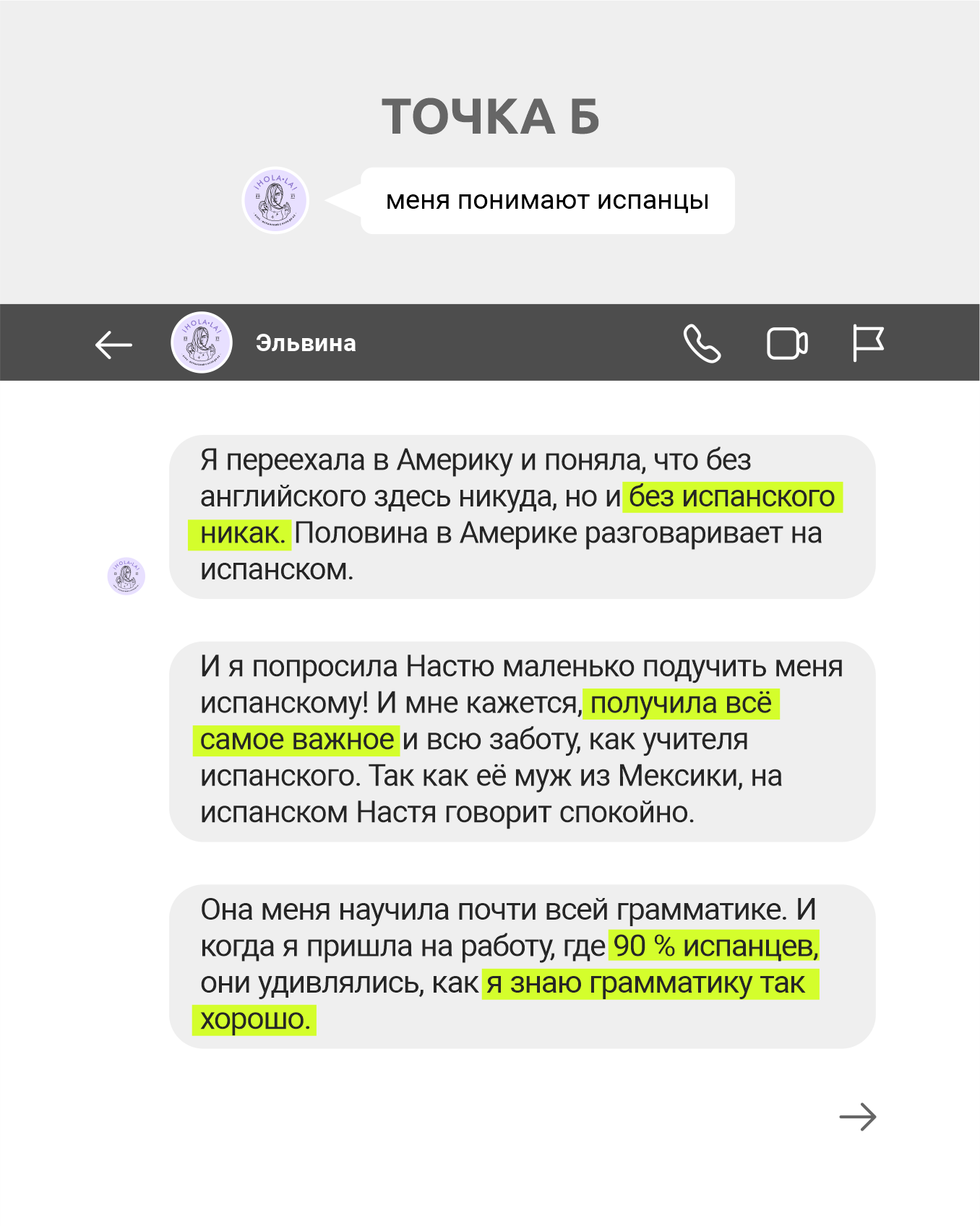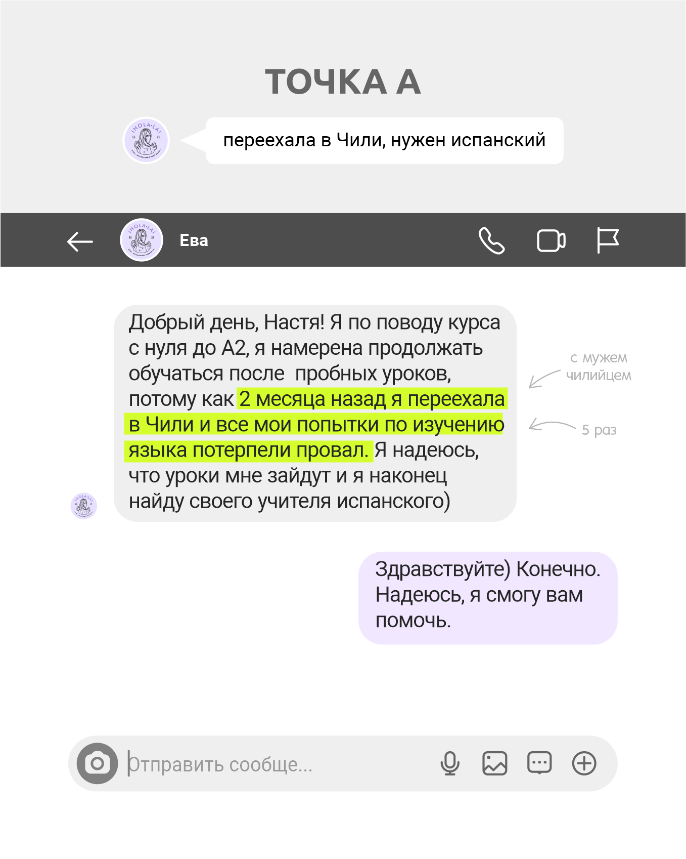 Точка А: нужен был язык, т.к. на начало курса Ева уже 2 месяца как переехала в Чили с мужем (чилийцем) + 5 раз начинала учить язык, но безуспешно.
