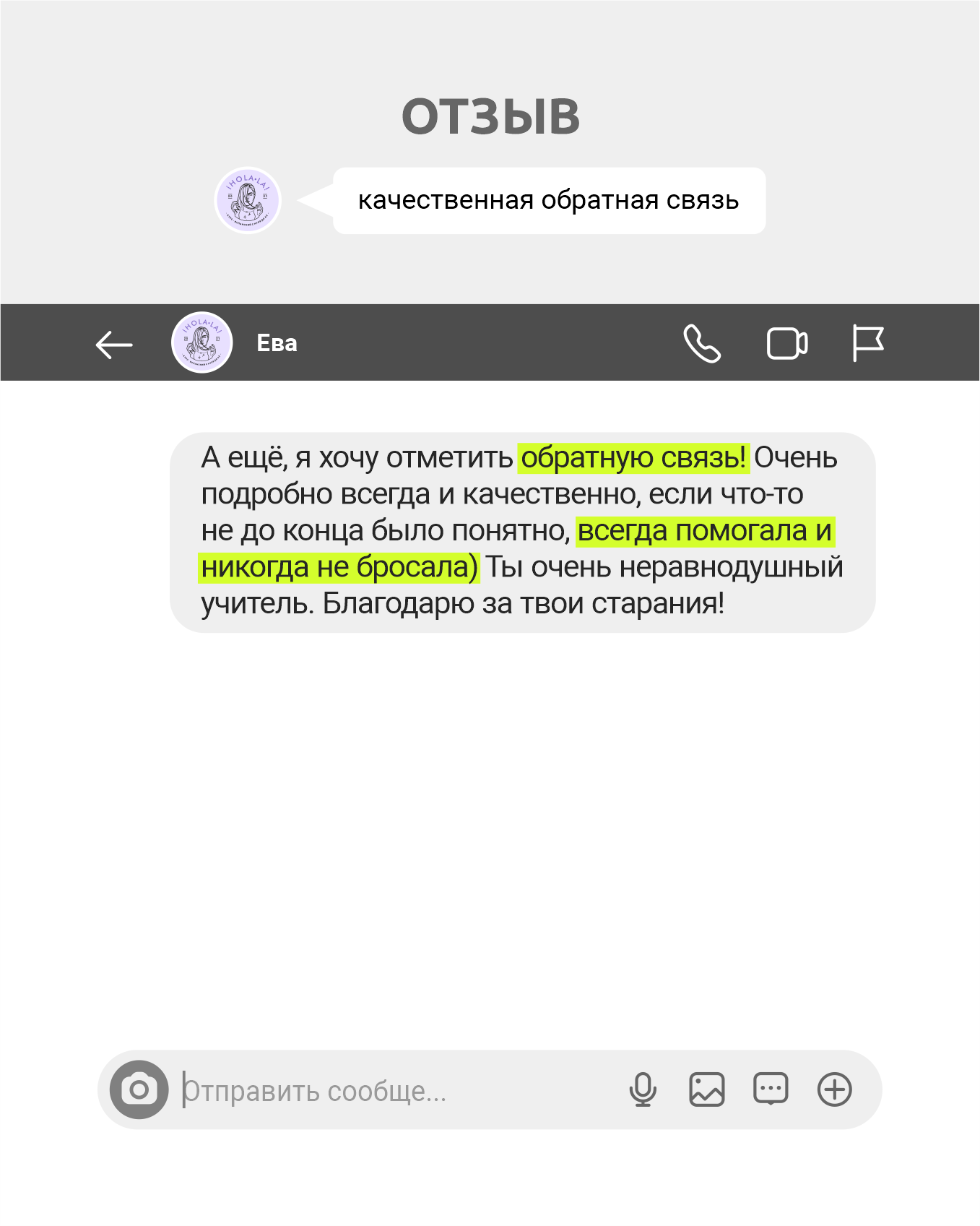 А ещё, я хочу отметить обратную связь! Очень подробно всегда и качественно, если что-то не до конца было понятно, всегда помогала и никогда не бросала) Ты очень неравнодушный учитель.