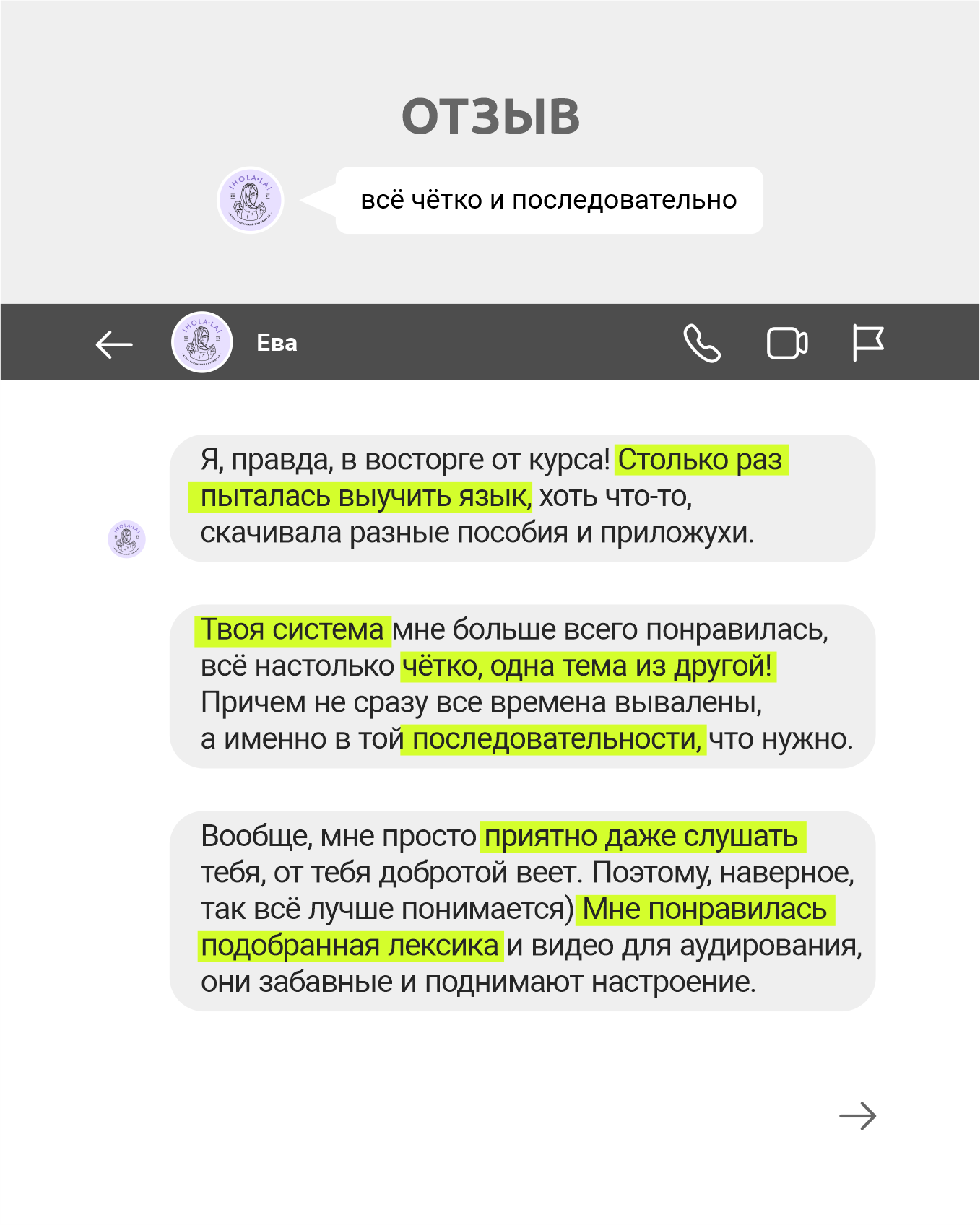 Добрый вечер, Настюша! Очень приятно тебя слышать. Вопросов нет. Мне очень понравилось как ты структурированно подаёшь материал, как распланированы занятия. Создалось впечатление, что курс очень чётко продуман. Ты большая умничка! <...> Ещё мне очень понравилось, что ты делаешь упор на жизненность языка, те его грани которые позволяют сразу применять. Это круто!
